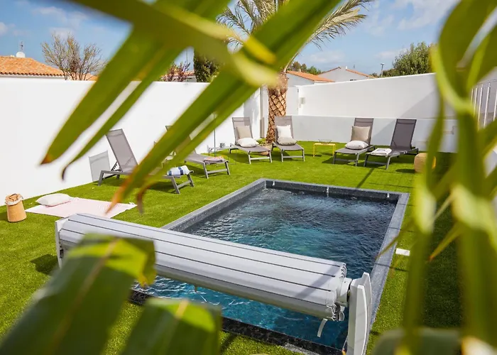 La villa Hortense, 1 min à pied plage Saint Martin de Ré, très calme, piscine chauffée, situada a tan solo 1 km de la Ciudadela, cuenta con una terraza con vistas a la piscina.